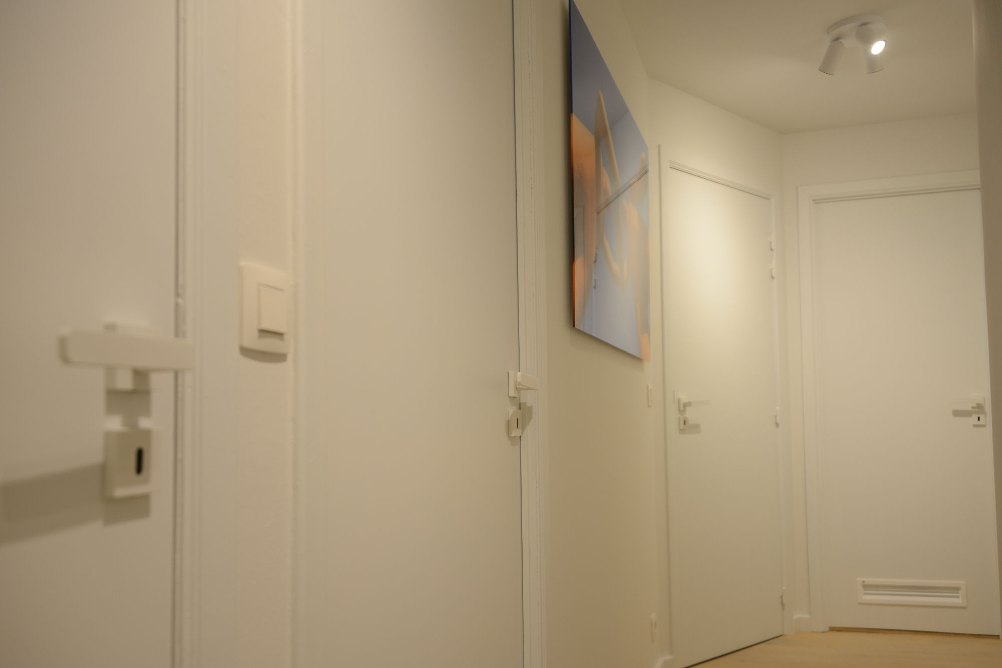 - De inkomhal loopt door naar een brede gang waar zich het slaapgedeelte en de badkamers bevinden.